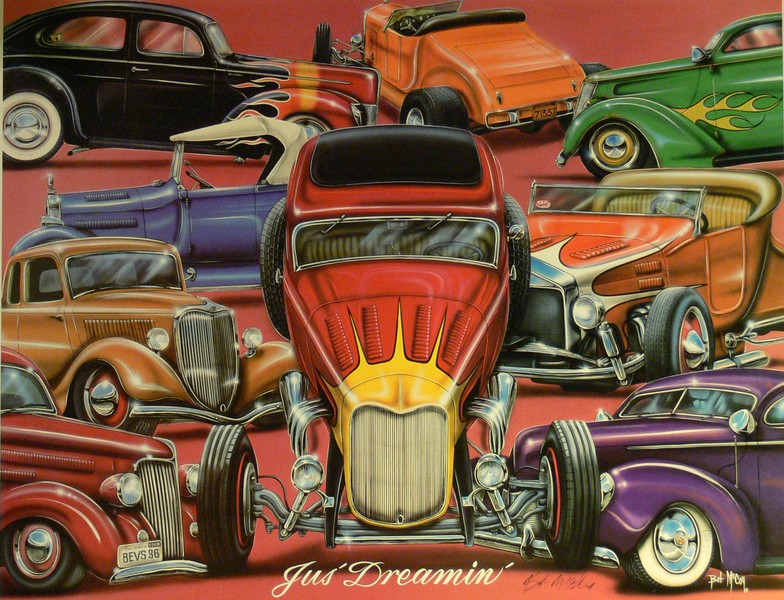 But he was so much more to so many people. To us here at Goodguys he was a rodder we looked up to. He was never short on opinions, tirelessly promoted pre’49 hot rods and never wavered from his passionate beliefs, including; a hot rod should be low, flamed and driven and sometimes raced! He was also someone who we leaned on for the perfect wall art to honor our Woman of the Year. He picked the Real McCoy award at Goodguys events for decades – an honor bestowed to a bitchin’ traditional hot rod. He was a close friend of our Founder & Chairman Gary Meadors, who Gary had deep respect and admiration for. McCoy’s signature “break out art” – where the car in the painting actually “breaks out” of the frame in a three dimensional landscape litters the walls of Goodguys headquarters in Pleasanton, Califiornia.