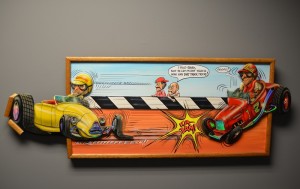 Bob McCoy’s art took a new direction in the mid-‘80s when he began painting commissioned portraits of friends’ hot rods and race cars. His commission work has grown so well in the last few years he no longer has time for commercial sign painting and flame jobs and striping. In addition to commissions, Bob has printed a number of his illustrations which he sells at street rod events and races in the West. His original paintings sell for $1,000 to as much as $5,000. His custom cartoon panels are almost always done to order and they’ve proved to be extremely popular for special awards and trophies and a great way to immortalize rods and rodders.
